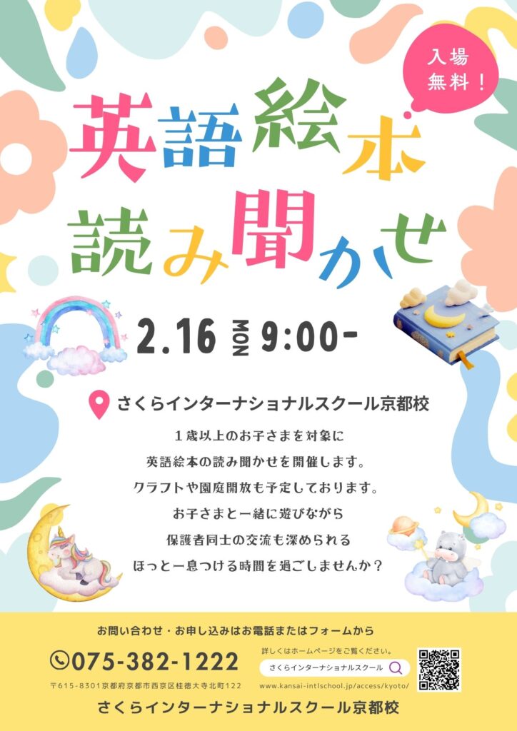 さくらインターナショナルスクール京都校で、2026年2月16日(月)9時から、1歳以上のお子様を対象に英語の絵本の読み聞かせを開催します。