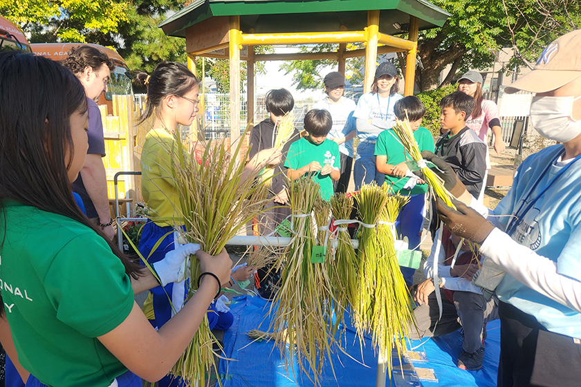 Then, on November 6, 2025, we celebrated our very first KIA Rice Harvest! The Grade 6 students cut and hand-threshed the rice using a traditional device custom-made by Mr. Shimizu for this special event. They even polished the grains by hand, and more than a few brave students tried tasting the raw rice along the way!