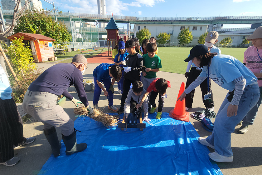 6年生たちは、清水先生がこの日のために特注してくださった伝統的な道具を使い、鎌で稲を刈り取り、手作業で脱穀を行いました。さらに、自分たちの手で玄米を精米する作業にも挑戦。作業の途中、勇気を出して収穫したばかりの生のお米を試食してみる児童もいました!