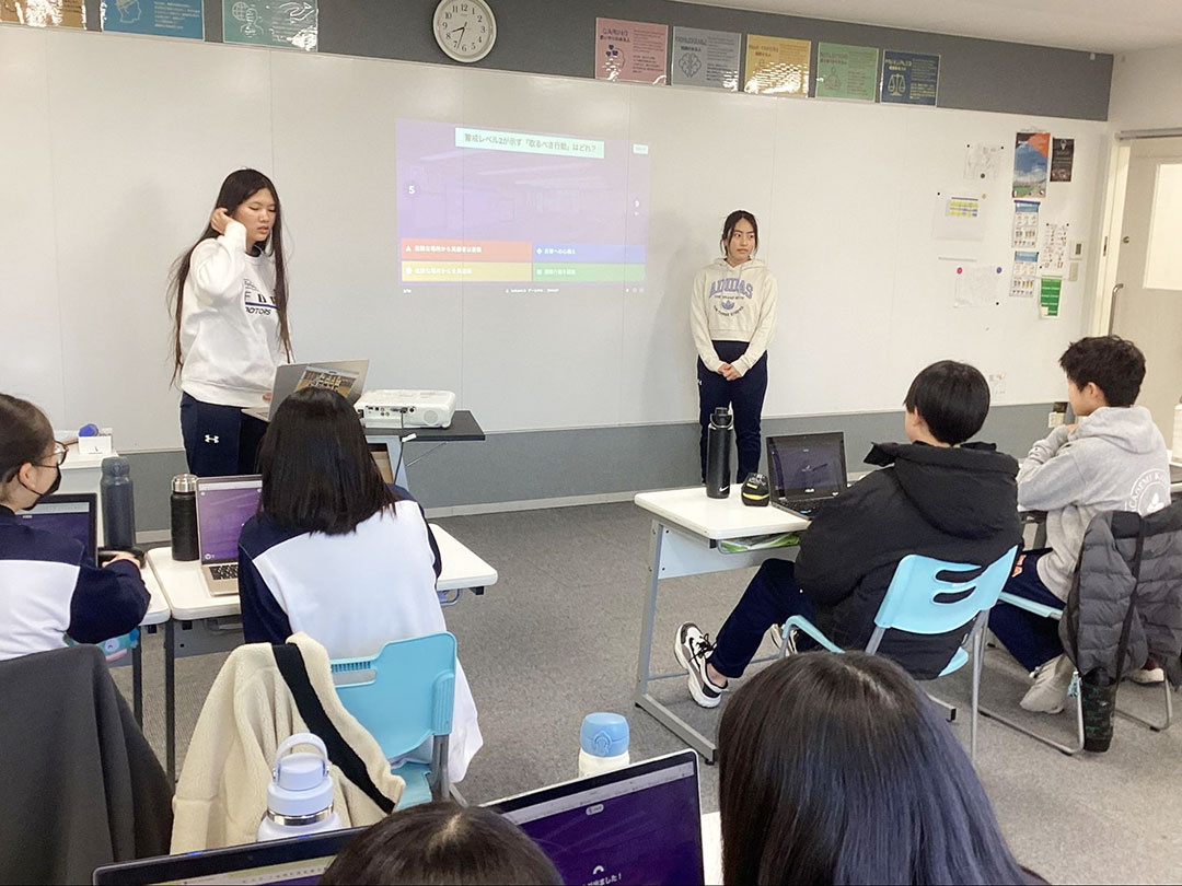 Based on official information from government organizations, a quiz was held in which students identified the appropriate evacuation actions corresponding to each of the five alert levels.