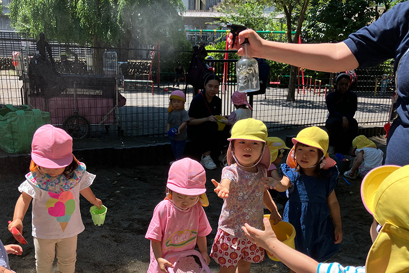 Using the WBGT, which is a heat index from the Ministry of the Environment, we adjust plans accordingly. On campuses that have playgrounds the children spray water on the ground with hoses while the campuses that play at parks spray each other with bottles and create mist showers. When children play indoors, they play with water or ice to stimulate multiple senses. We always try to make sure they enjoy themselves. We hope they experience coolness by not only touching water but by also looking at it.