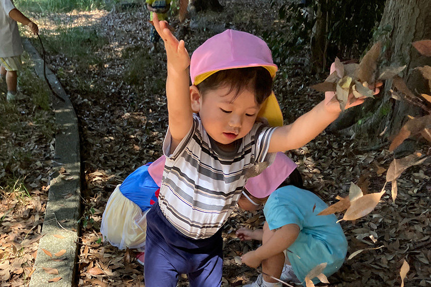 秋から冬にかけての外遊びでは、どんぐりや松ぼっくり、落ち葉など子どもたちの好奇心をくすぐる刺激がいっぱい!バギーに乗ってお散歩したり、友だちと手を繋いで歩きながら、豊かな自然を全身で味わっています。