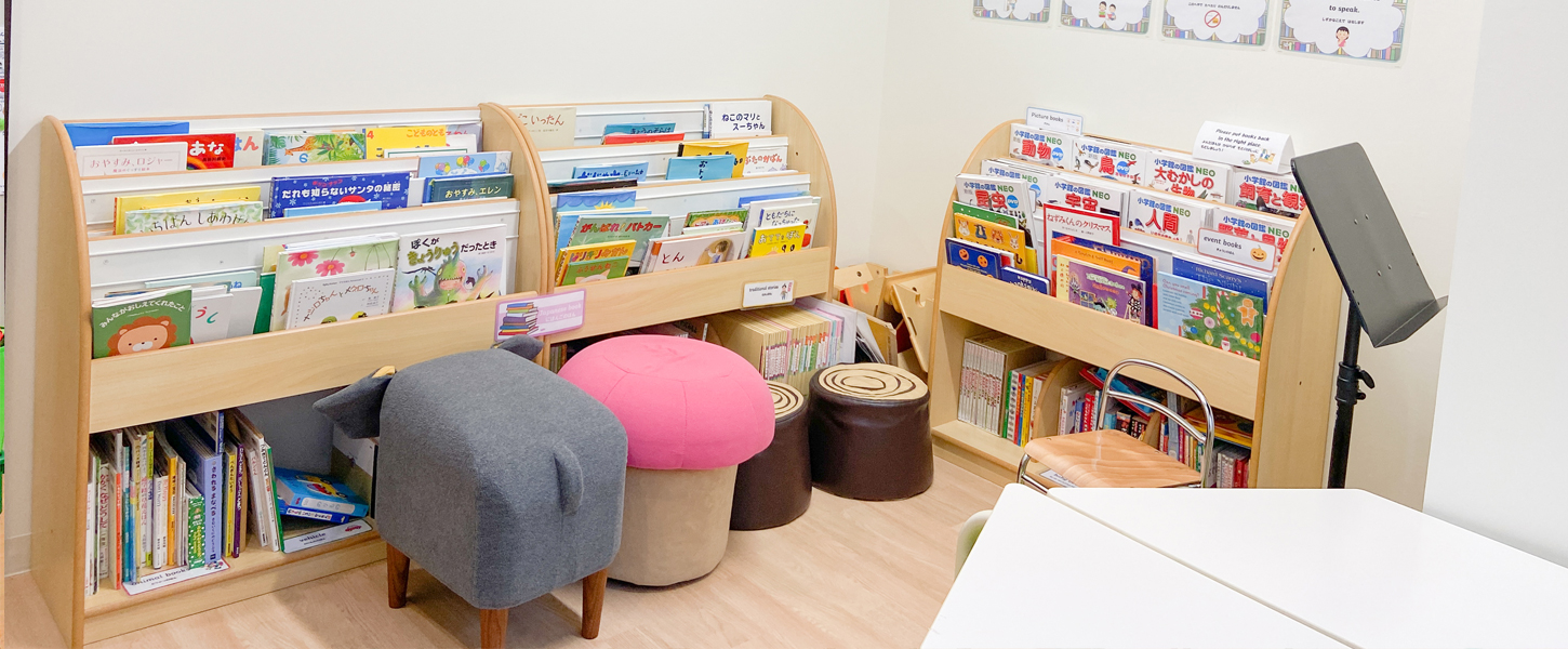 ライブラリーには、英語や日本語だけでなくフランス語や中国語の絵本も用意し、子どもたちが自由に読むことができます。可愛い壁紙と、フカフカのラグ仕様で、リラックスしながら絵本を楽しめます!