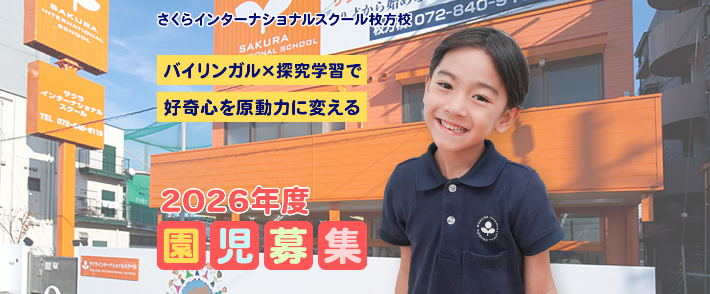 オレンジ色の外壁が目印のさくらインターナショナルスクール枚方校は、アットホームな温かさと国際的な学びが融合した日英バイリンガルのインターナショナルスクールです。当園では、バイリンガル教育を軸に、子どもたちの好奇心と創造性を育む探究学習を取り入れています。