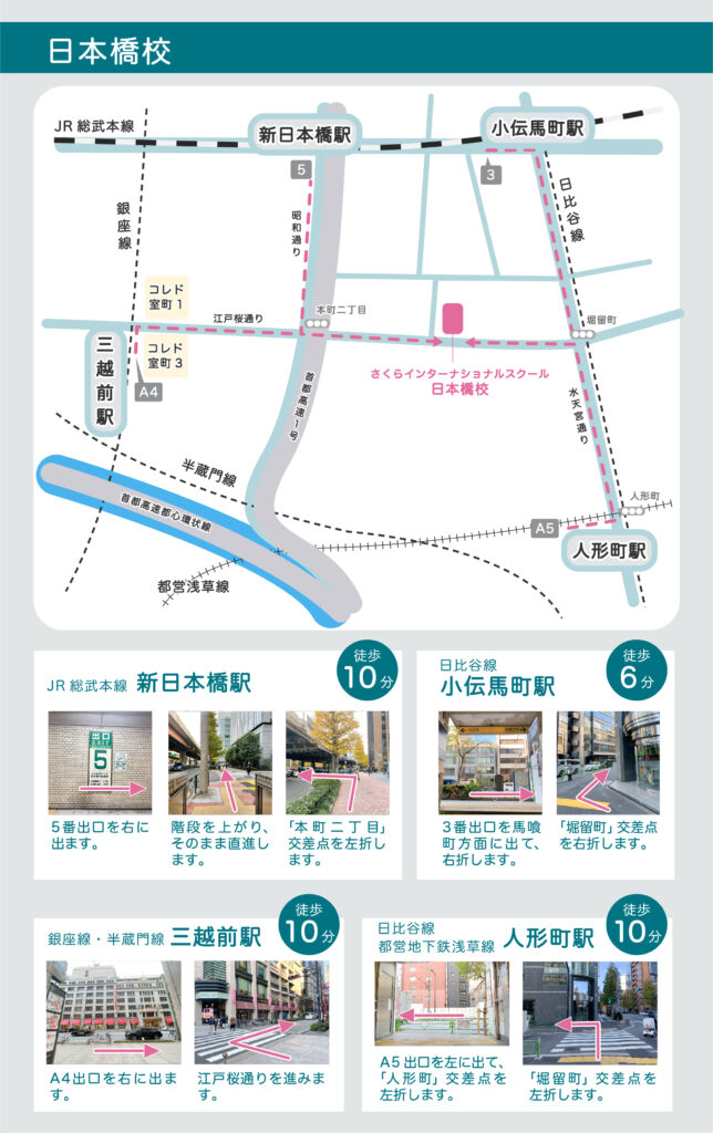 歴史的建築と近代建築が共存する日本橋に位置する日本橋校は、地下鉄の駅からも近くアクセス良好です。日本橋校専用の入り口とエレベーターが設置されており、セキュリティーも安心です。 広々とした教室内には、大きい窓から降り注ぐ明るい陽射しと、子どもたちの笑顔が溢れています。