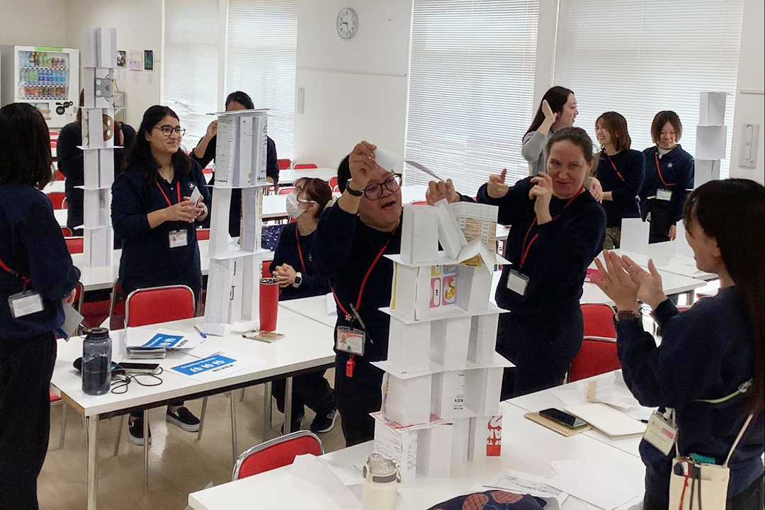 新年度を迎えるにあたり、より良いチームワークの関係構築のためチームビルディング研修も実施しました。あるキャンパスでは、チームで紙30枚を使い、限られた時間で自立したタワーを作る、「ペーパータワー」のアクティビティを行いました。