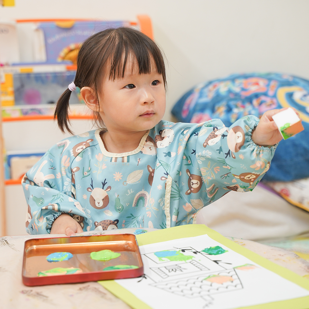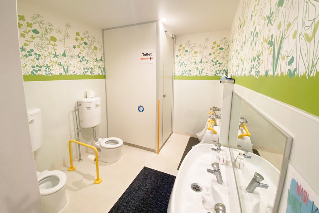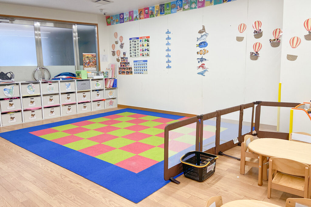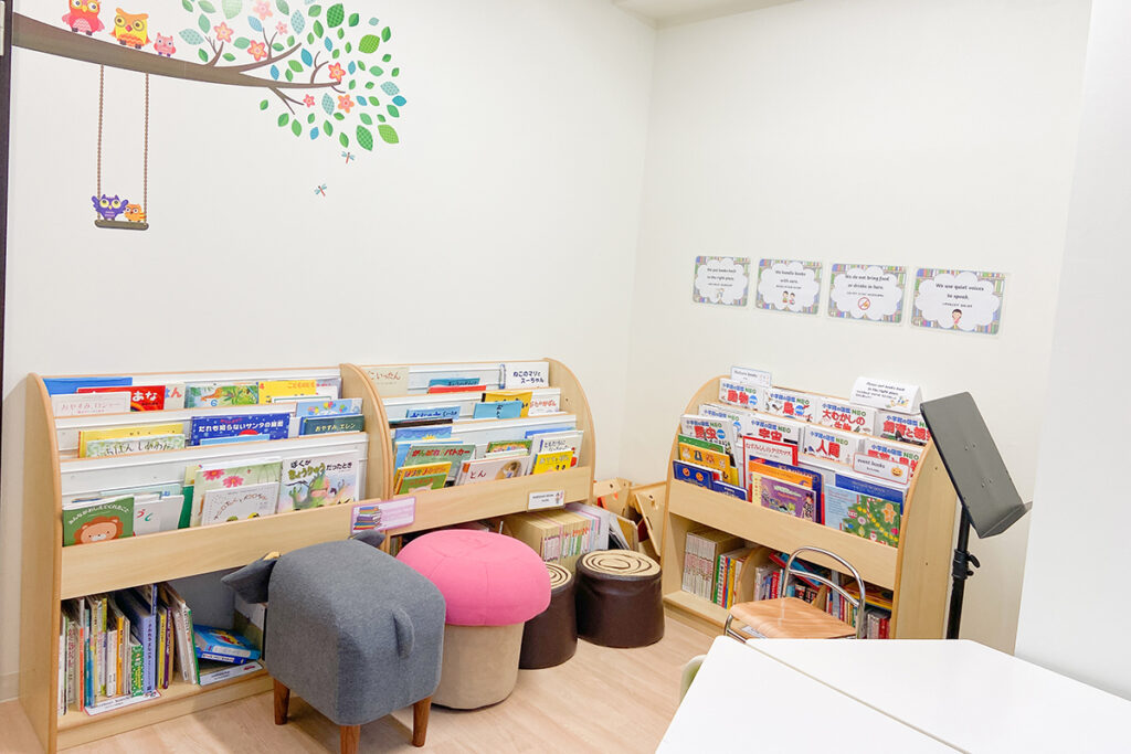 ライブラリーには、英語や日本語だけでなくフランス語や中国語の絵本も用意し、子どもたちが自由に読むことができます。可愛い壁紙と、フカフカのラグ仕様で、リラックスしながら絵本を楽しめます!